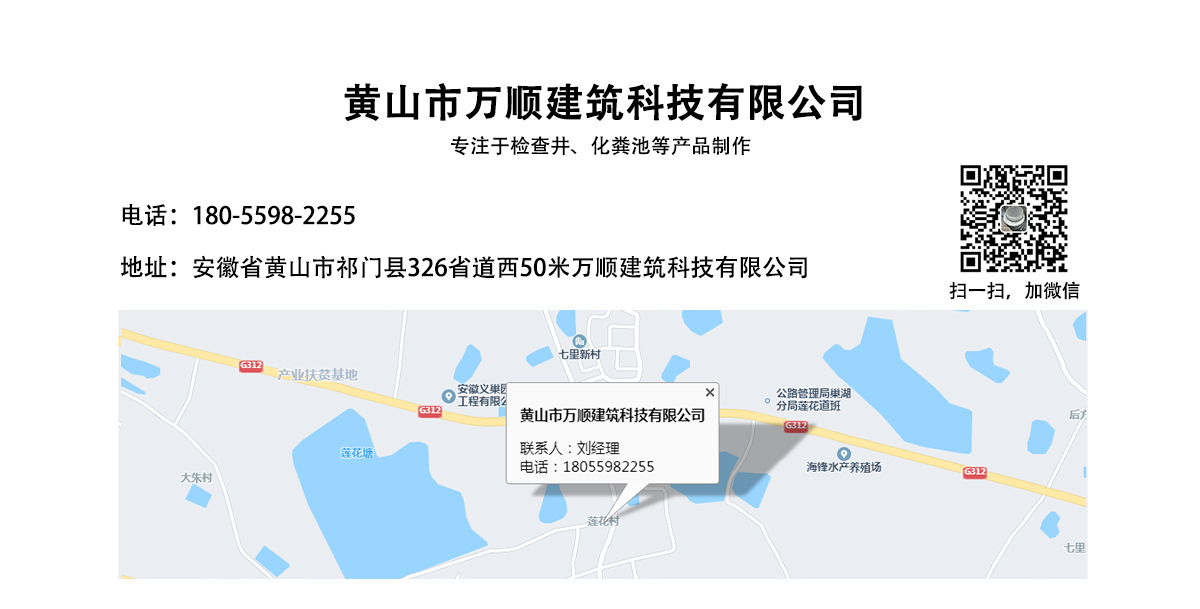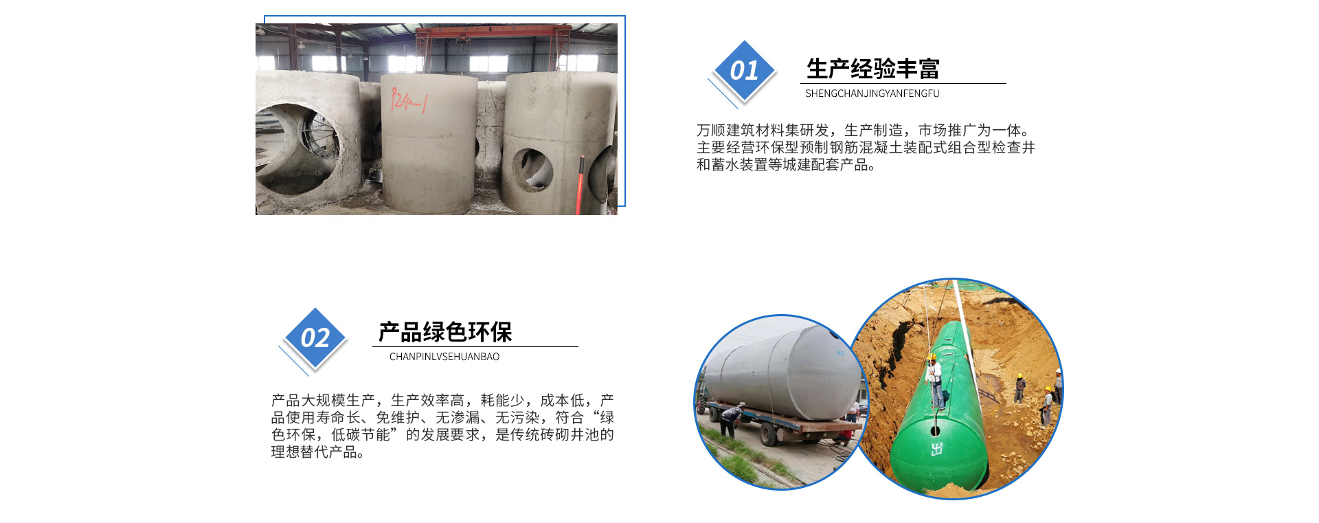 黃山市萬順建筑科技有限公司是集研發(fā),生產(chǎn)制造,市場推廣為一體的綜合性企業(yè)。公司主要經(jīng)營環(huán)保型預(yù)制鋼筋混凝土裝配式組合型檢查井和蓄水裝置等城建配套產(chǎn)品。產(chǎn)品生產(chǎn)過程采用獨特的生產(chǎn)工藝,機(jī)械化流水作業(yè)。產(chǎn)品大規(guī)模生產(chǎn),生產(chǎn)效率高,耗能少,成本低,產(chǎn)品使用壽命長、免維護(hù)、無滲漏、無污染,符合“綠色環(huán)保,低碳節(jié)能”的發(fā)展要求,是傳統(tǒng)磚砌井池的理想替代產(chǎn)品。
